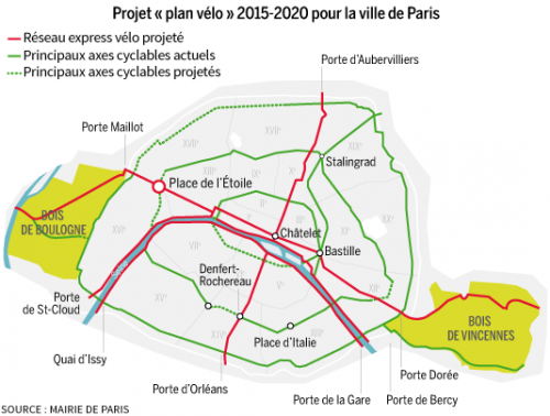 Desde 2007 a cidade possui o sistema de locação de bicicletas Vélib’ (leia aqui) e, até 2020, a prefeita Anne Hidalgo pretende transformar Paris na capital mundial da bicicleta criando, entre outras coisas, ciclovias protegidas e expressas às margens do Sena e nos eixos norte-sul e leste-oeste da cidade.