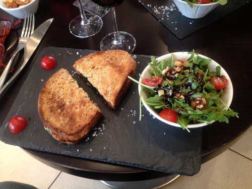 Quanto aos acompanhamentos, a qualquer hora você pede um plateau de queijos ou embutidos. E na hora do almoço, por 10 euros, você tem um sanduíche acompanhado por uma salada e depois café + pequenas pâtisseries.