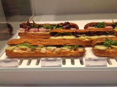 Eles servem éclairs recheados com salmão defumado, ou presunto, ou frango assado e diversas saladas e legumes crus.