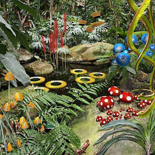 O artista incorporou a este cenário vegetal, flores feitas com escovas e objetos fabricados com fibras industriais. A paisagem se torna assim híbrida e onírica.