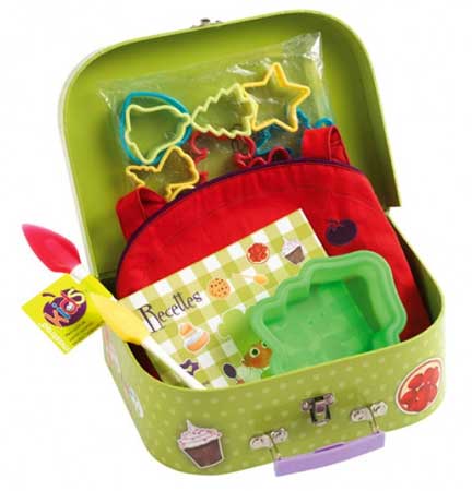 Dentro da malinha você encontra: uma colher, uma espátula, forminhas, um avental, uma toque e um livro de receitas.
