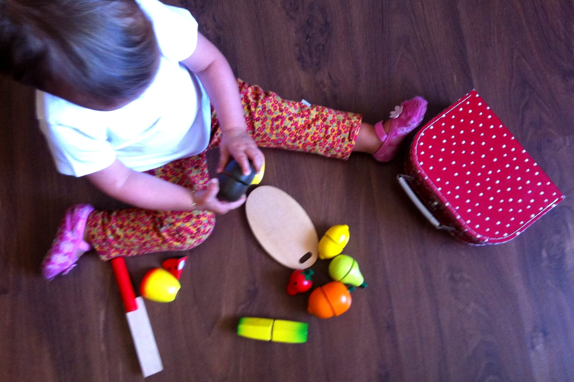 Frutinhas de madeira. As metades são unidas com velcro, a criança usa a faquinha para cortá-las ao meio.