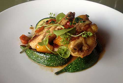 Frango bio com chorizo e abobrinhas com basílico (26 euros).