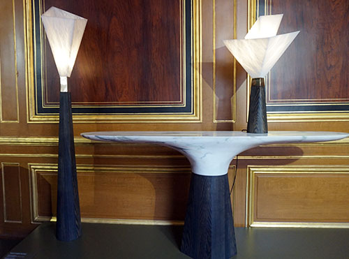 Destaque para a console Convergence (Damien Langlois-Meurinne), base de madeira e tampo de mármore.